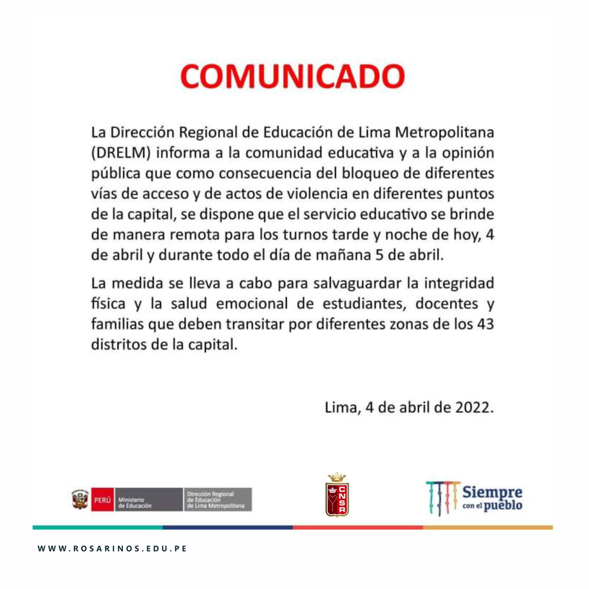 La Dirección Regional de Educación de Lima Metropolitana ha dispuesto que el servicio educativo se brinde de manera remota para los turnos tarde y noche de hoy, 4 de abril, y durante todo el día de mañana, 5 de abril, en las instituciones públicas y privadas de los 43 distritos de nuestra ciudad. opinión pública: